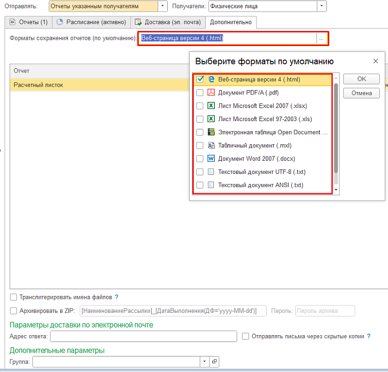 • «Свой отчет для каждого получателя» — используется, если нужно отправить индивидуальные отчеты каждому получателю.