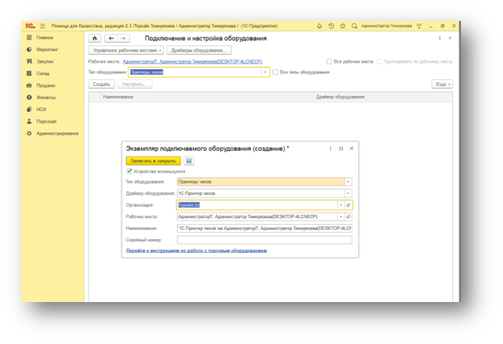 Указываем тип оборудования, драйвер, рабочее место, наименование. После этого — «Записать и закрыть».