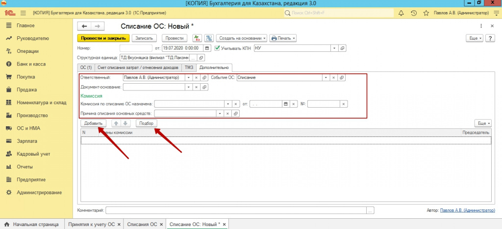 На вкладке «Дополнительно», указываем комиссию и председателя, участвующую в списание ОС.
