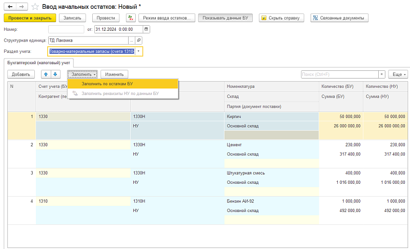 Документ также создается через «Ввод начальных остатков», с режимом «только Налоговый учет» и выбором раздела «Товарно-материальные запасы». Используем заполнение по остаткам БУ.