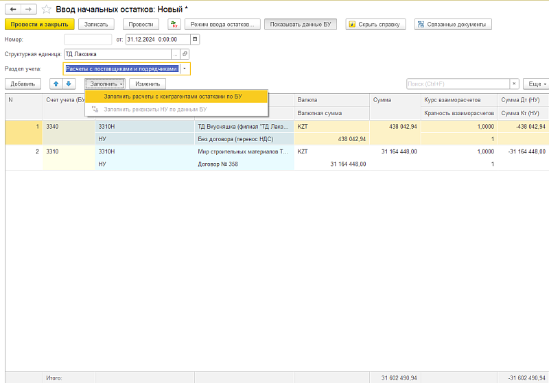 Переходим по кнопке «Заполнить» → «Заполнить по остаткам БУ» — данные подгрузятся автоматически из бухгалтерского учета.