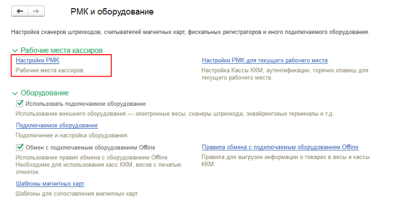 Заходим в «НСИ и администрирование» — «Администрирование» — «РМК и оборудование» — «Рабочие места кассиров» — «Настройка РМК».
