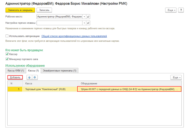 Переходим «НСИ и администрирование» — «Администрирование» — «РМК и оборудование» — «Рабочие места кассиров» — «Настройка РМК». В закладке «Кассы» указываем кассу организации и подключаемое оборудование с типом «ККТ с передачей данных».