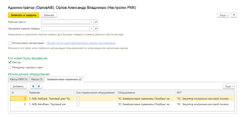 Заходим «НСИ и администрирование» — «Администрирование» — «РМК и оборудование» — «Рабочие места кассиров» — «Настройка РМК». В закладке «Эквайринговые терминалы» указываем терминал — оборудование с типом «Эквайринговые терминалы» и подключаемое оборудование с типом «ККТ с передачей данных».