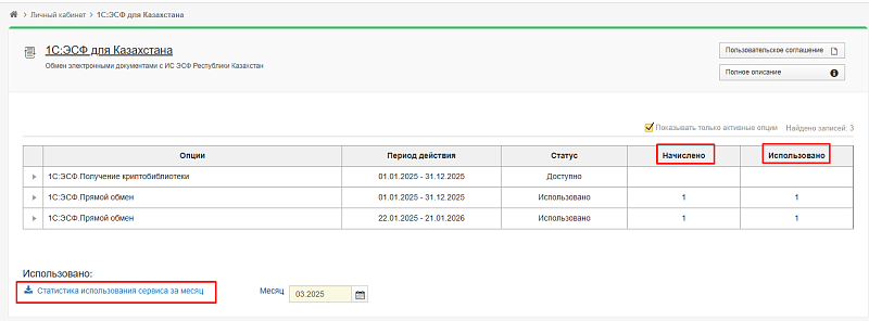• ИТС Аренда Казахстан — означает что опция по сервису была списана с организации, которая первой провела обмен с ИС ЭСФ.