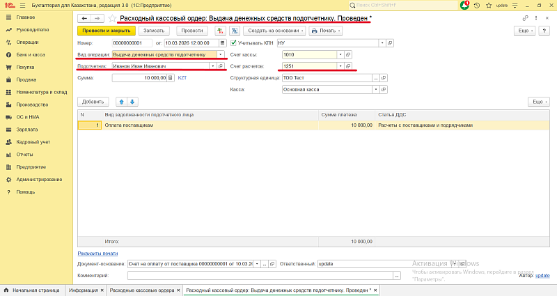 Шаг 1. Выдать деньги сотруднику под отчет