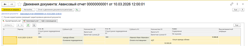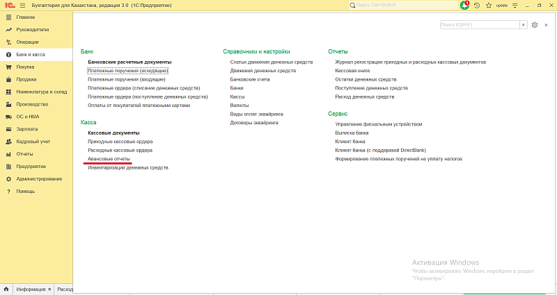Банк и касса → Авансовые отчеты