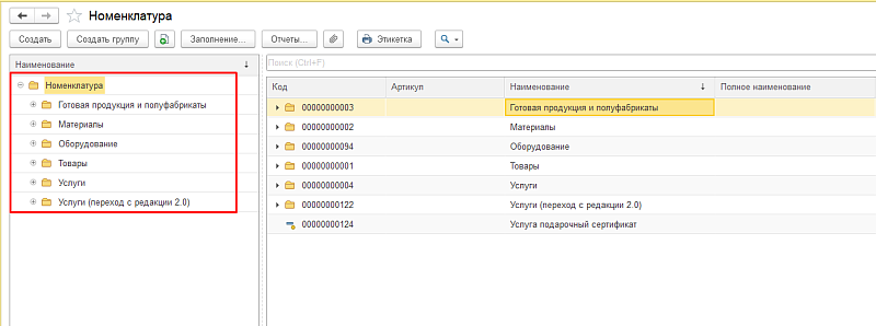 2. Попадаем в справочник. Он состоит уже из групп по умолчанию: «Готовая продукция», «Материалы», «Товары и Услуги». Их можно дополнить своими группами и подгруппами.
