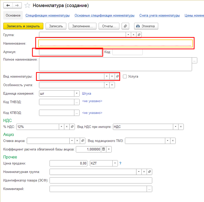 Все вы создали номенклатурную позицию. Чтобы внести новую, все эти действия надо повторить. К сожалению, даже если вы ведете учет в excel-таблицах, инструмента для синхронизации в типовой конфигурации «1С: Бухгалтерия для Казахстана» не предусмотрено.