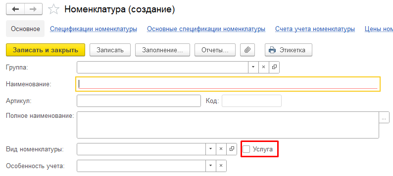 Если создаем услугу, обязательно ставим отметку «Услуга». Без этого номенклатуру нельзя будет использовать как услугу.