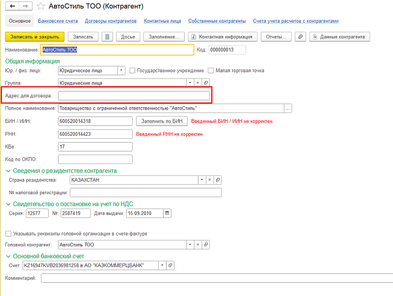 После установки расширения необходимо заполнить дополнительный реквизит «Адрес контрагента» в карточке контрагента.