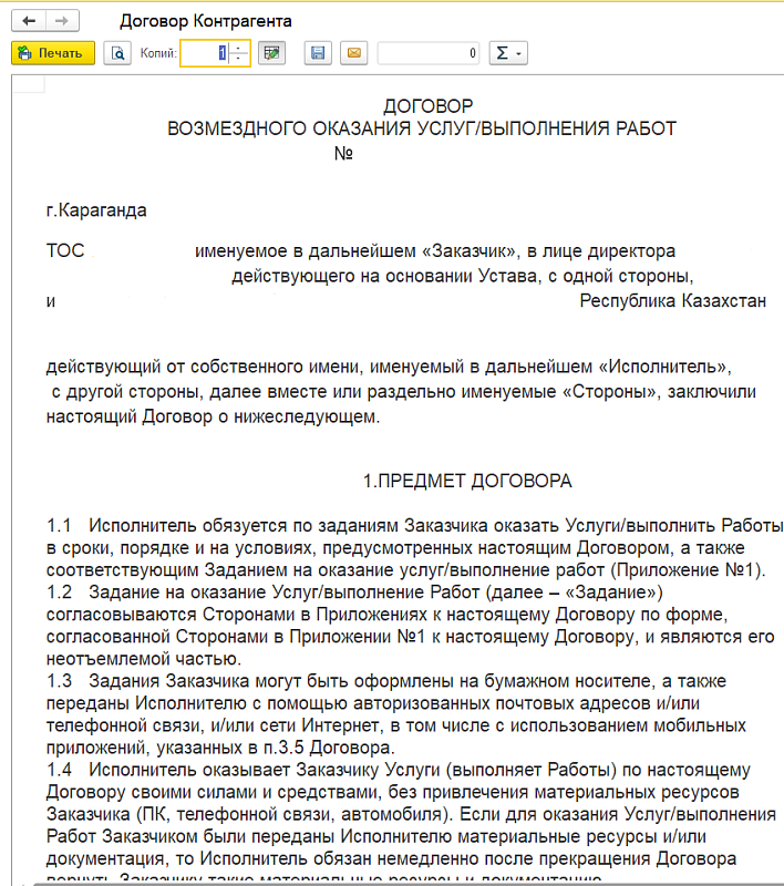 Мы разработали расширение для «1С: Бухгалтерия для Казахстана», с помощью которого можно формировать и печатать договоры ГПХ, не выходя из базы. При этом документ автоматически будет заполняться данными обеих сторон соглашения и можно использовать факсимильную подпись и печать организации.