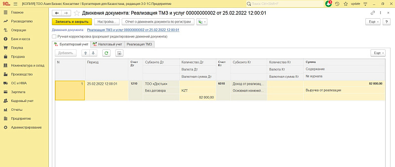 - Отражение реализации услуг ТОО «Достык» на основании акта выполненных работ Дт 1210/Кт 6010 — 82 000 тг.