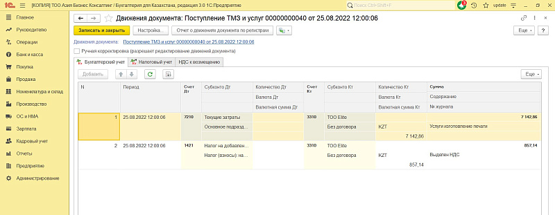- Получение услуги от ТОО «Elite» Дт 7210/Кт 3310 (если стоимость услуги с НДС 1421/3310).