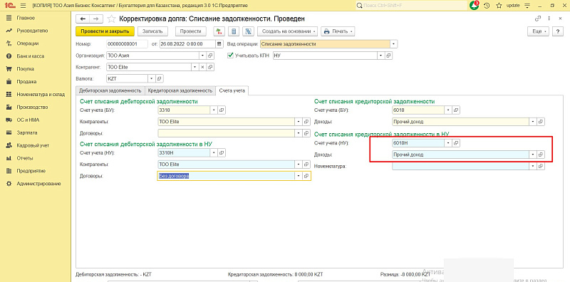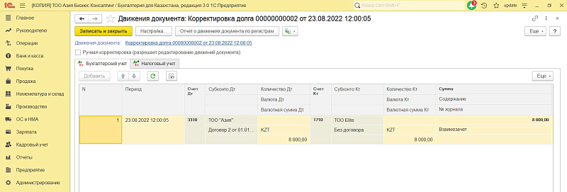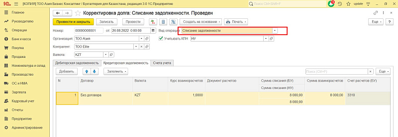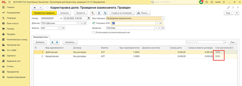 - Корректировка долга перед ТОО «Азия» Дт 3310/Кт 1710.