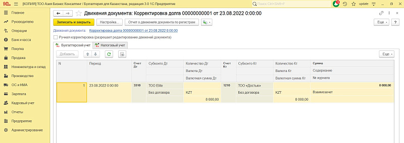 У ТОО «Азия» есть дебитор — ТОО «Достык», которой оказали услуги на 82 000 тг. В свою очередь «Азия» приобретает услуги на 8000 тг у ТОО Elite.