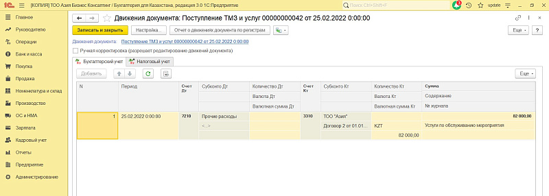 - Получение услуги от ТОО «Азия» Дт 7210/Кт 3310 — 82 000 тг. (если стоимость услуги с НДС 1421/3310).