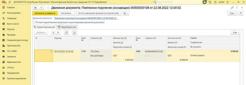 - Оплата задолженности за ТОО «Азия» Дт 1710/Кт 1030 — 8000 тг.
