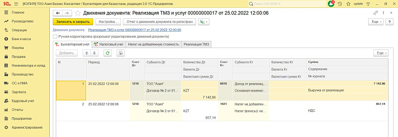 - Реализация услуги ТОО «Азия» Дт1210/Кт 6010 (Если плательщик НДС 1210/1421)