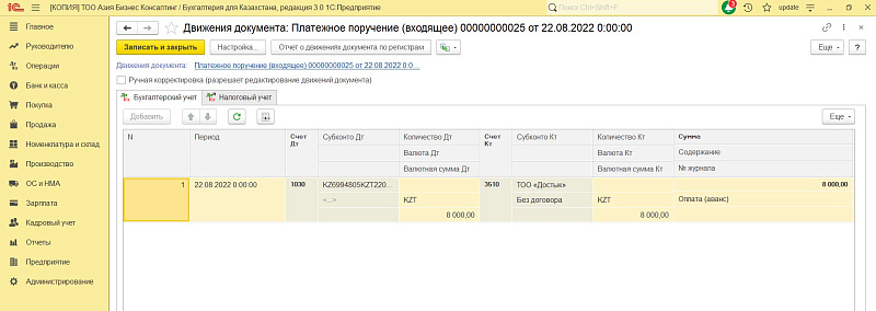 - Поступление оплаты от ТОО «Достык» за ТОО «Азия» Дт 1030/3510.