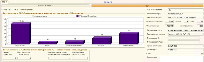 Для этого мы использовали тест Гилева — один из наиболее распространенных инструментов оценки производительности 1С-систем. Мы рассматриваем его как технический бенчмарк, а не как маркетинговый показатель.