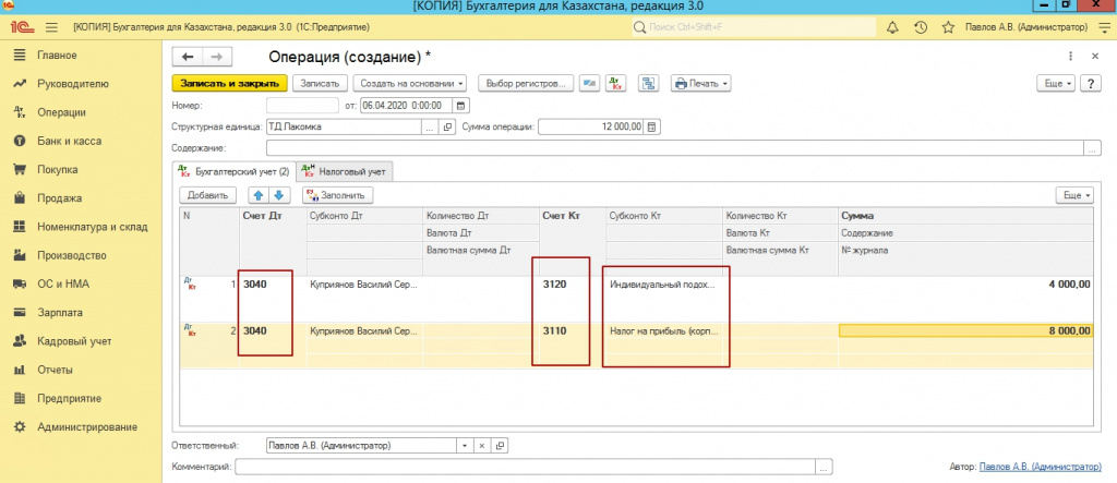 Перед нами откроется окно создания операции. Добавляем новую строку. В счете по дебету указываем счет начислений дивидендов -5620, по кредиту указываем счет 3040 – выплата дивидендов. Затем либо отдельной операций, либо в этом же окне, создаем еще одну строку, и начисляем ИПН и КПН, если, дивиденды выплачиваются владельцу акций, до 3-ех лет.