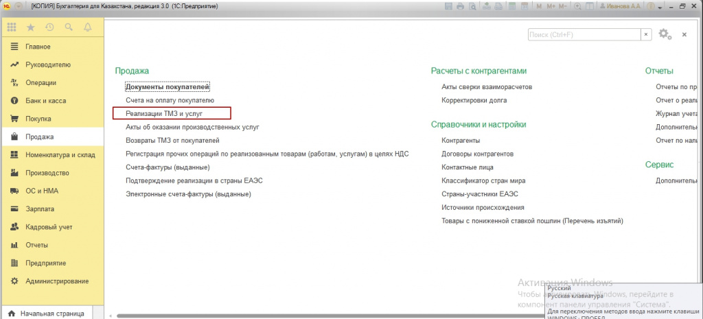 Если вам необходимо оформить продажу в 1С, мы переходим во вкладку меню Продажа-Реализация товаров и услуг. Нажимаем кнопку «Создать».
