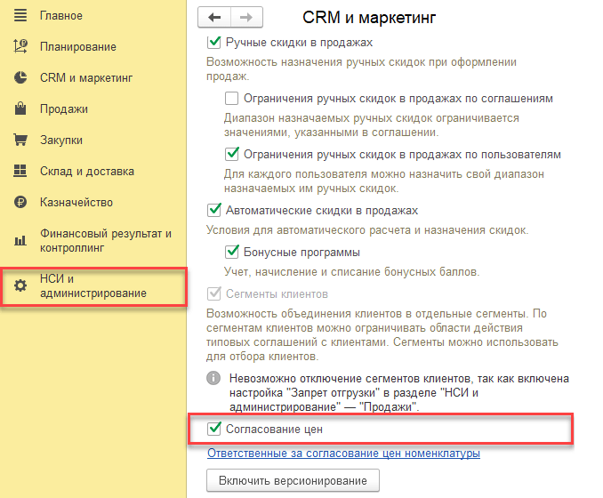 - Чтобы открыть возможность настроить цепочку согласования цен, надо отметить пункт «Согласование цен» в разделе «НСИ и администрирование». Далее переходим «Настройка НСИ и разделов» — «CRM и маркетинг» — «Маркетинг».