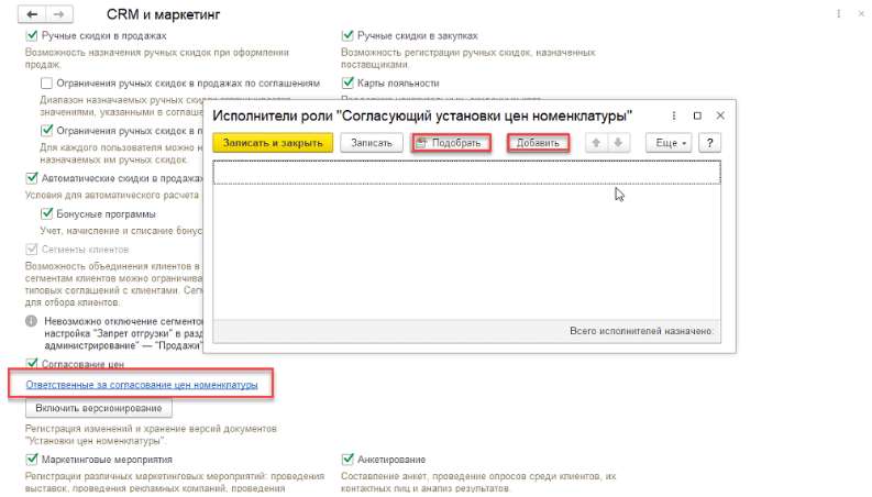 - Под строкой «Согласование цен» будет пункт «Ответственные за согласование цен номенклатуры». Нажимаем и, с помощью команд «Подобрать» или «Добавить», выбираем пользователей, ответственных за согласование цен. После добавления всех ответственных, нажмите «Записать и закрыть».