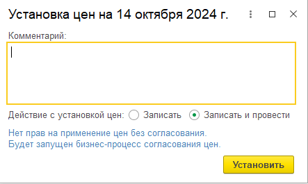 Теперь при создании установки цен номенклатуры будет выводиться системное сообщение о том, что нет прав на применение цен без согласования, запустится бизнес-процесс.