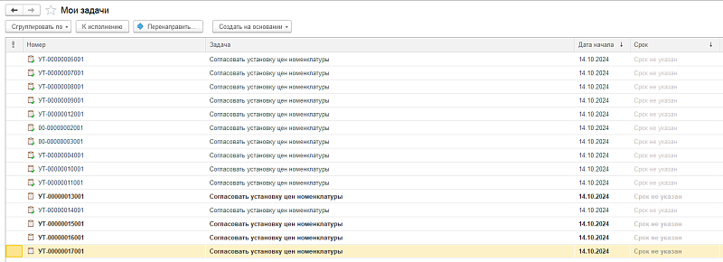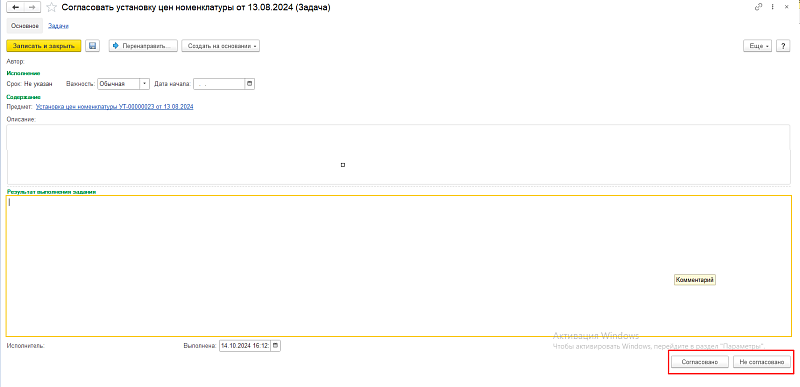 Автоматически запуститься бизнес-процесс и ответственному пользователю поступит задача на согласование цены.