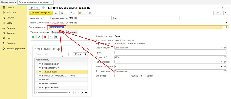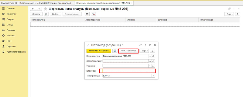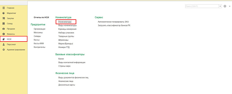 Для добавления новой позиции в номенклатуру надо пройти по цепочке «НСИ» — «Номенклатура» — «Создать».
