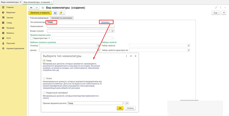 - В строке «Тип номенклатуры» через кнопку «Изменить» можем выбрать нужные параметры.