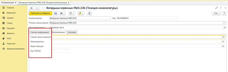 - Вкладка «Дополнительно» позволяет прописать такие параметры, как страна происхождения, производитель, бренд, код ТНВЭД.