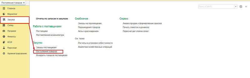 Чтобы оформить оприходование товара в «1С: Розница», надо на боковой панели кликнуть «Закупки» и перейти «Поступление товара» — «Создать».
