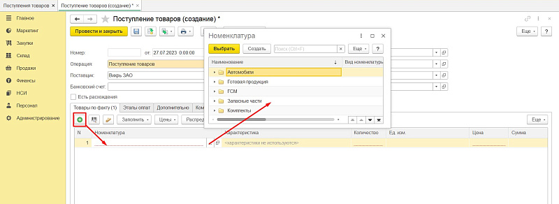- Добавление новой строки и выбор номенклатуры из списка.