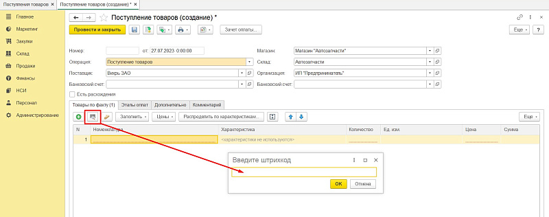 - Добавление по штрихкоду через кнопку поиска. Откроется окно, в котором надо ввести штрихкод вручную или с помощью сканера считывания кода (если оборудование подключено).