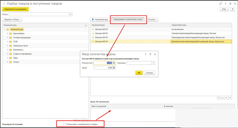 - Добавление списка ТМЗ. Нажимаем «Заполнить» — «Подобрать товары». Откроется окно выбора позиций. Для удобства можно установить настройку «Показывать подобранные товары». Список отобразится в нижней части открывшегося окна. Над списком можно настроить выбор товара кнопками «Характеристики», «Остатки». Здесь же находятся кнопки «Создать», для создания новой номенклатуры, и «Запрашивать количество и цену», для заполнения параметров на этапе выбора товара. Выбор позиций из папок или общего списка производим двойным щелчком мыши. После подбора товаров нажимаем «Перенести в документ».