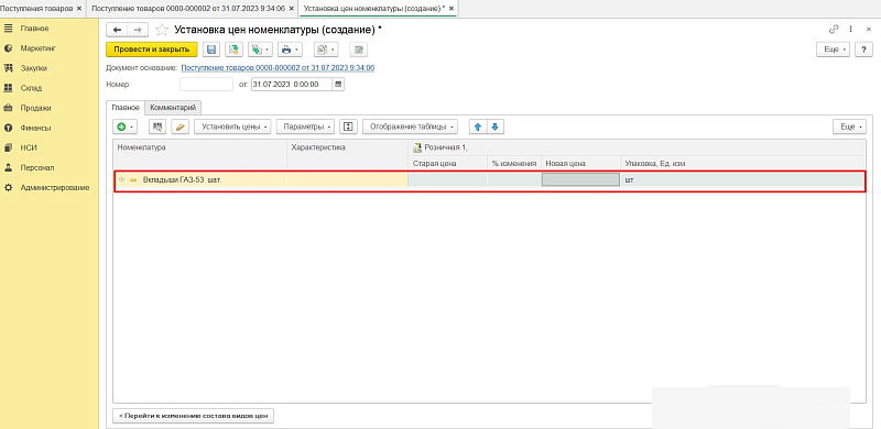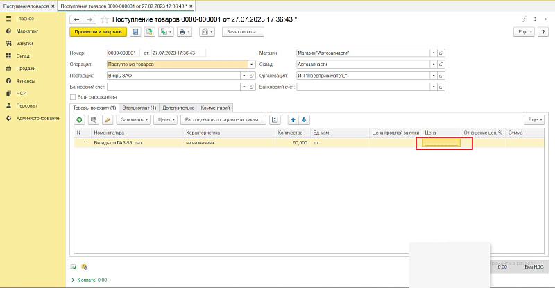 В табличной части заполняем закупочные цены.