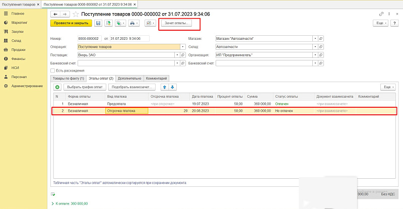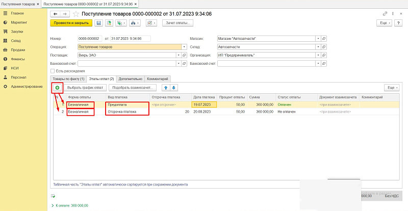 Далее переходим на вкладку «Этапы оплат». После ввода новой строки выбираем форму оплаты, вид платежа, если есть отсрочка — прописываем срок отсрочки. В нашем примере была предоплата 50 % от суммы и вторая половина с отсрочкой 20 дней.