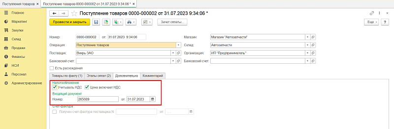 Во вкладке «Дополнительно» заполняем данные документа поставки и поставляем признаки по НДС в зависимости от категории налогоплательщика.