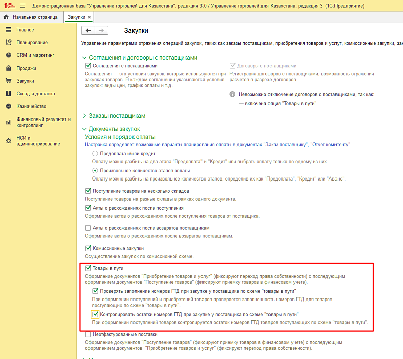 - Переходим в раздел «НСИ и администрирование» далее «Закупки» — «Документы закупки». Ставим галочку напротив пункта «Товары в пути».