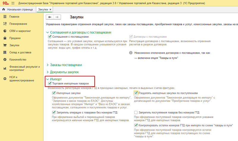 - Далее надо убедиться, что в системе включена возможность оформления закупок по импорту. В разделе «НСИ и администрирование» заходим в «Закупки» — «Импорт». Должен быть отмечен пункт «Торговля импортными товарами».