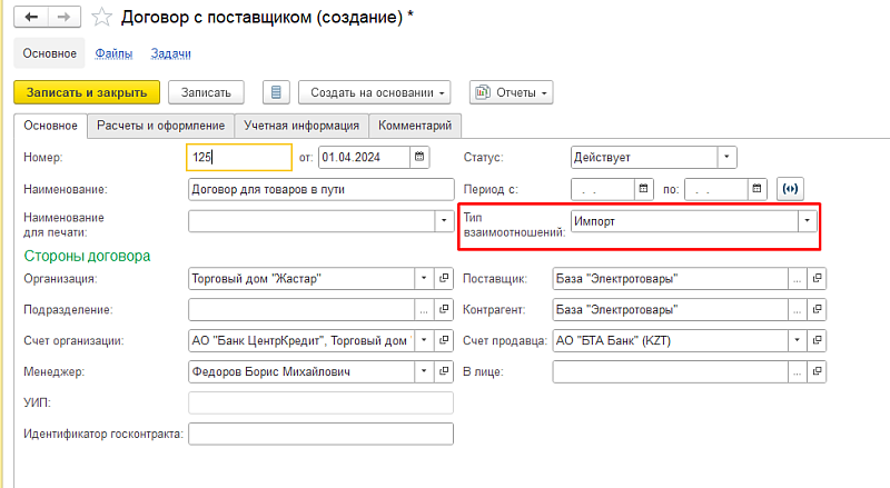 - На закладке «Основное» устанавливаем тип взаимоотношений «Импорт».