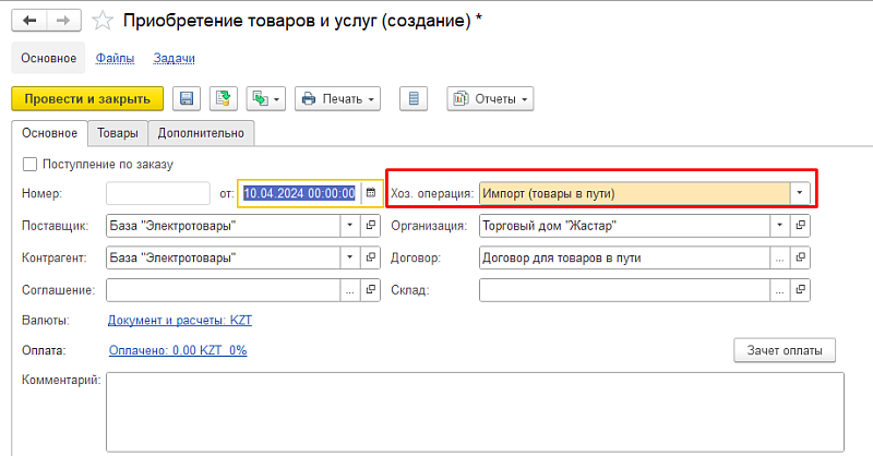 Нам нужен документ «Приобретение товаров и услуг». Заполняем поставщика товаров, указываем организацию и созданный нами договор. Основное внимание уделите пункту «Хоз. операция». После включения настройки «Товары в пути» становятся доступными операции «Закупка у поставщика (товары в пути)», «Импорт (товары в пути)» и «Ввоз из ЕАЭС (товары в пути)». Выбираем «Импорт (товары в пути)».