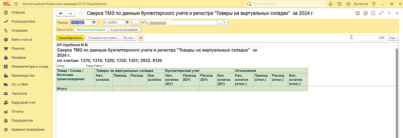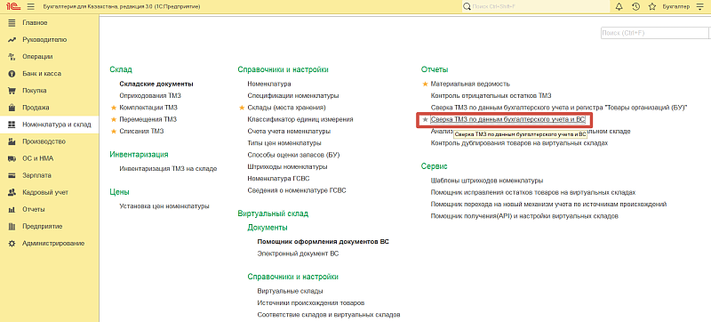 После входа в базу данных переходим к разделу «Номенклатура и склад» и в подразделе «Отчеты» выбираем «Сверка ТМЗ по данным бухгалтерского учета и ВС».