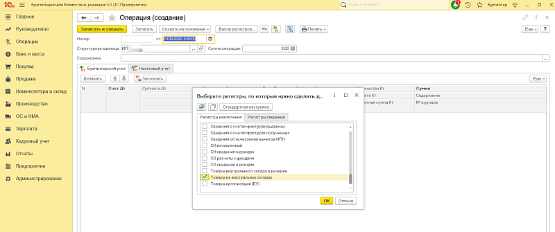 Если появились расхождения, надо сделать выравнивание источников в 1С. Чтобы не вносить исправления в предыдущие периоды, нужен документ операции в регистре «Товары на виртуальных складах». Создайте новый документ операции и выберите регистр накопления.