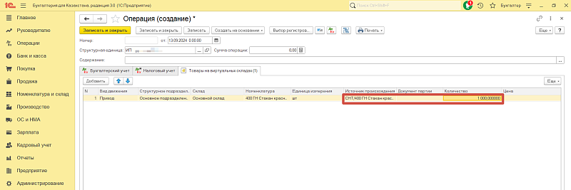Появится новое окно, в котором нужно произвести отражение «прихода» товара по определенному источнику. Выберите склад, номенклатуру, единицу измерения и источник происхождения (с минусом).