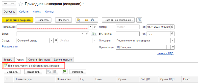 ⚠️ Важный момент. Документ «Приходная накладная» подходит для включения услуг в себестоимость только при совпадении поставщика, накладной и даты. Если условия разные — лучше использовать другие инструменты учета.