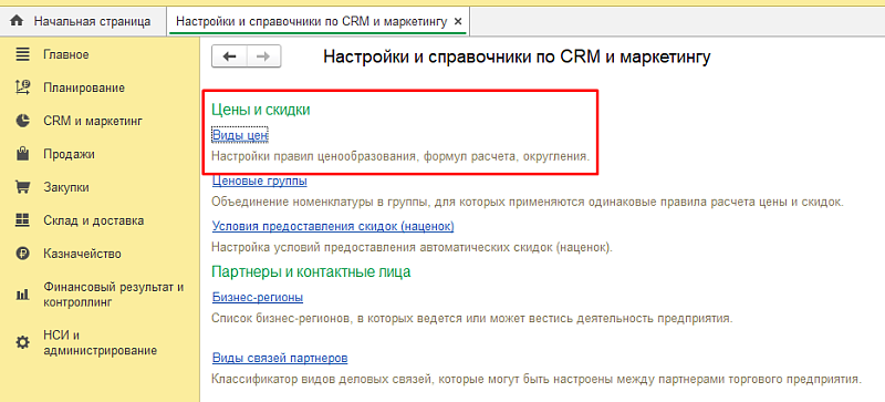 Теперь можно приступить к созданию правил классификации. Перейдите в «CRM и маркетинг» — «Настройки и справочники» — «Цены и скидки». Отметьте «Виды цен».